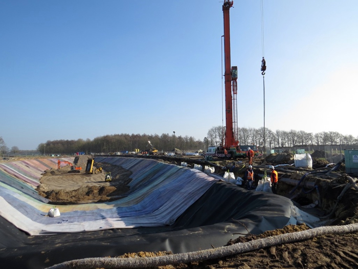 7. 土工膜鋪設(shè)完成后,應(yīng)盡量減少在膜面上行走、搬動(dòng)工具等,凡能對(duì)防滲膜造成危害的物件,均不應(yīng)放在膜上或攜帶在膜上行走,以免對(duì)膜造成意外損傷。